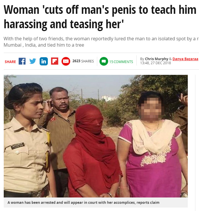 印度孟買一名女子長期受到一名30歲男子的騷擾跟戲弄,為了要教訓這名男子,她夥同2名朋友,把人引誘到一個偏僻的地方綁在樹上,並將男子的「生殖器」砍下後逃離現場。