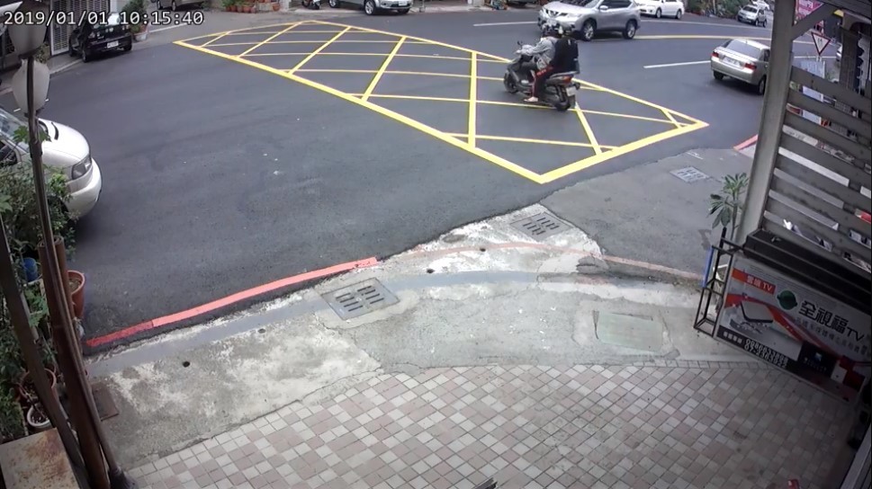 影片中,事發路段的車流量並不大,一名戴著紅色安全帽的阿伯先左轉進畫面右邊的巷子,接著停在路邊似乎是在整理東西;而穿著灰色外套的騎士緩緩從巷子裡騎出來,但好像沒有注意到來車,才騎到路中央就被主幹道的銀色汽車攔腰撞上,兩人彈飛到半空中約半層樓高,再摔到引擎蓋上,其中一頂安全帽噴飛到路邊,嚇得原本停在路邊的阿伯馬上停下動作並回頭張望。