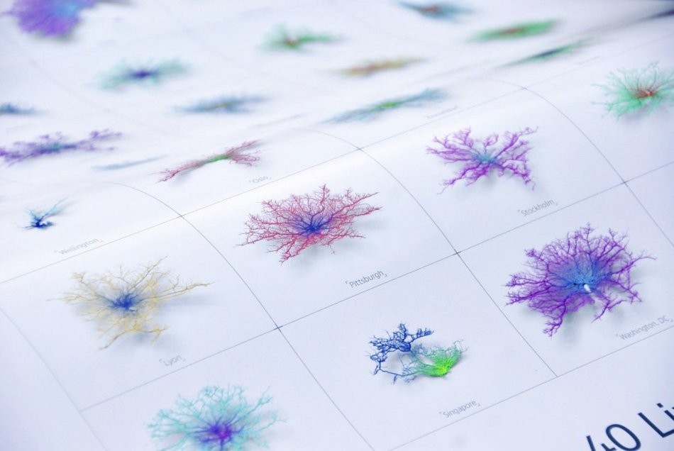數據分析公司ITO World的數據可視化設計(Data Visualization Design)經理Craig Taylor(克雷格・泰勒)創造了一個美麗表格,展示世界上最適合居住的城市。該項目以在城市模擬種植珊瑚的表現方式,通過顏色渲染的街道網絡,描繪城市基礎設施。把市中心30分鐘車程的距離的街道描繪出來,稱為珊瑚城市,該項目已擴展到包括世界上40個主要城市。