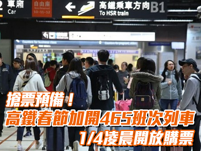 今(108)年春節共有9天假期,為服務旅客返鄉團圓及年節出遊需求,台灣高鐵公司今(2)宣布自31日(四)至2月11日(一)規劃為期12天的春節疏運,共加開465班次列車,1月4日(五)凌晨零時起開放搶票,可透過「T Express」手機購票系統、高鐵合作之便利超商、網路訂票系統、語音訂位系統,或於車站營業時間至售票窗口及自動售票機,一次預購春節疏運期間所需的車票。