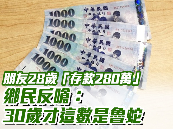 28歲該有多少存款才合理?一名網友在ptt女版(WomenTalk)表示,朋友雖然家境普普,但是存款已經有280萬,「我的嘴真的不誇張到掉下來,他認為是因為他沒有女朋友的關係」。其他鄉民看完後反應兩極,有人認為30歲存款只有這個數字是魯蛇,也有人說這個年記如果領死薪水,能有這個存款都是非常幸運。