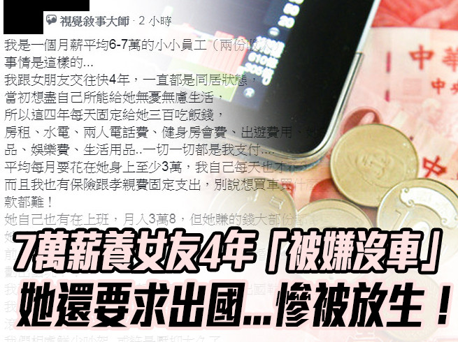 原PO在《爆怨公社》表示,和女友穩定交往近4年,兩人同居中,每天他會給女方300元吃飯費用,另外,房租水電、電話費,出遊費用,治裝費、化妝品等一切都由他出,只因為想盡所能給一個「無憂無慮生活」,這些開銷最少就要3萬,他還有自己的保險費、孝親費等,別說想買車,連存錢都很難,但女方也不是沒有工作,月收有3萬8,只是大部分的錢都寄回家。