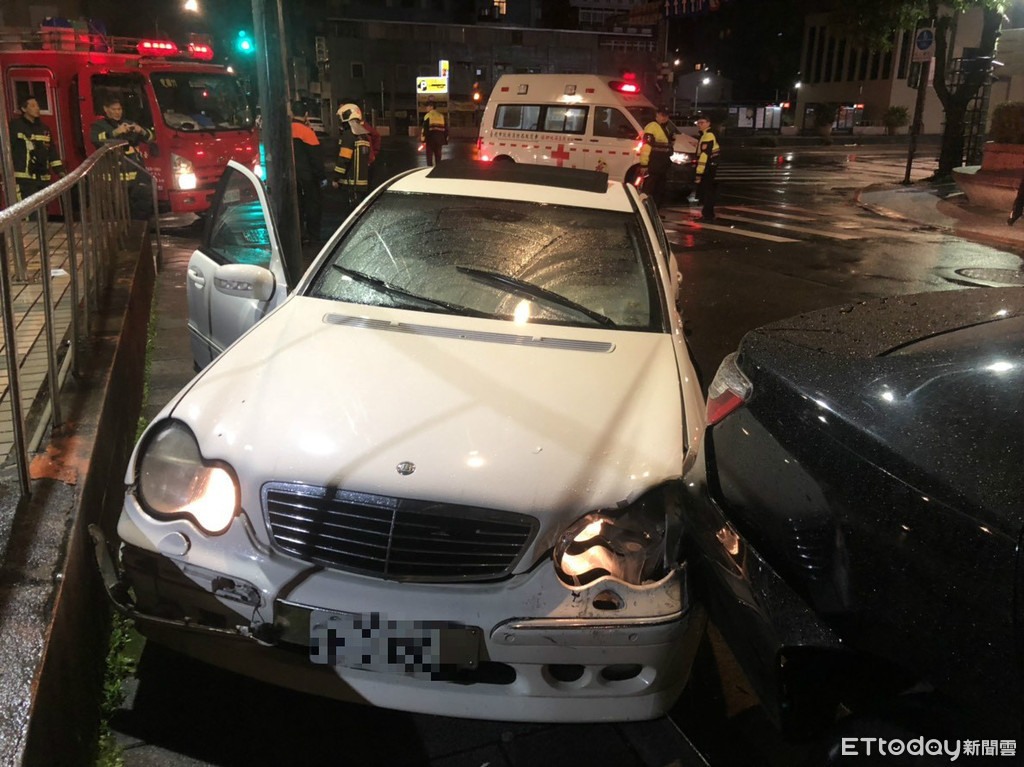 ▲白色賓士擦撞執勤中的救護車後失控,撞上路旁停放的黑色轎車。(圖/記者趙永博攝)