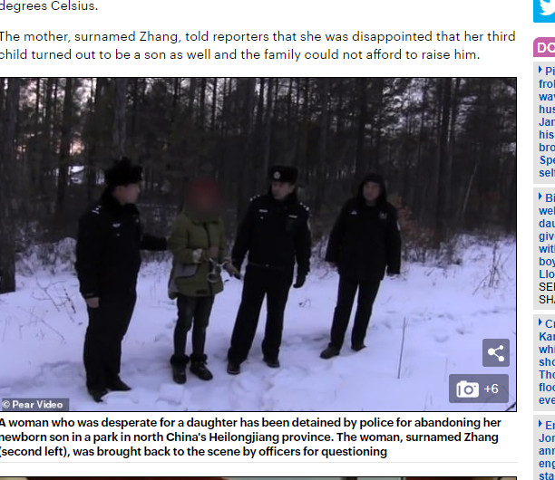 大陸黑龍江省一名僅有2個月大的嬰兒,在去年12月24日時被發現,臉色慘白的被棄置在一處公園,而且當時的氣溫低於零下28度。當地警方獲報之後立即開始追查,並找到一名嬰兒的生母張女,張女表示,懷孕時以為是女兒才沒墮胎,沒想到生下來後卻是個男孩,才決定把小孩丟掉。