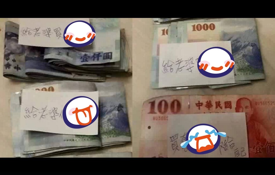 最後一疊千元鈔裡雖然最薄,但是是要「給老婆買好吃的」,這些錢也絕對足夠;3疊給老婆獎勵下,有一張超薄的100元鈔票,靜靜躺在最下層裡,紙上寫著「買套新衣服給自己」,展現疼妻的氣魄。
