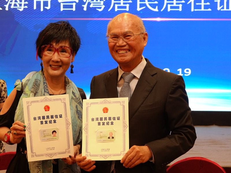 ▲拿到「001」首張上海台灣居民居住證的是前上海台協會長李茂盛(右)。(圖/上海市台辦提供)