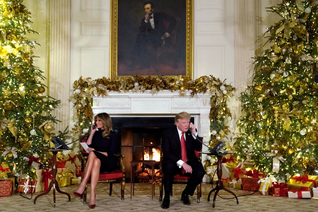 ▲川普無所不能。圖為他和第一夫人梅蘭妮婭在白宮內接聽電話,回答小朋友有闗聖誕老人的問題。(圖/路透)