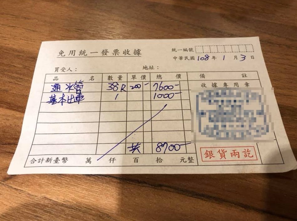 網友一看,紛紛留言表示,「這麼黑還不用繳稅,檢舉他」、「這價格有誇張!是通101嗎?」、「這價格可以馬桶打掉換新的也不用那麼貴」、「我們這邊通水管的師父才收1000元,而且沒有另外收費!」。另外還有眼尖的網友發現收據上怪怪的,照理說38尺算起是7600元,加上出車費1000元,總額應該是8600元,但收據卻寫8700,硬是又被多收100元。
