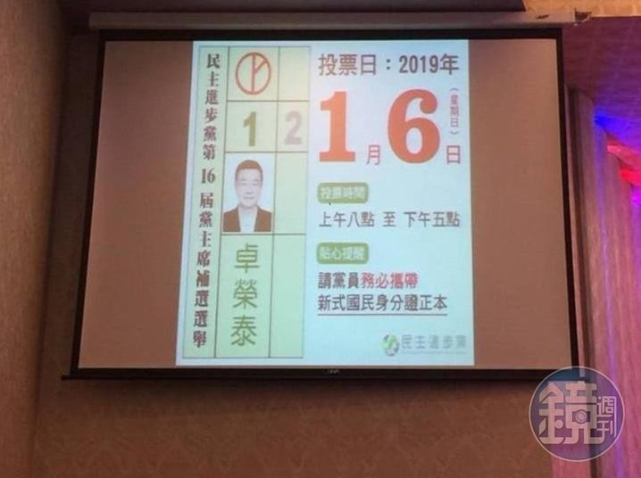 整場免費的餐會10人一桌,每桌桌上都有2本的黨員名冊,主持人聲嘶力竭不斷敦促:「把名冊上面的人找出來」「票投卓榮泰」。這做法讓席間的老民進黨員看不下去,憤而錄下過程向調查局檢舉,希望民進黨內外都能徹查賄選。