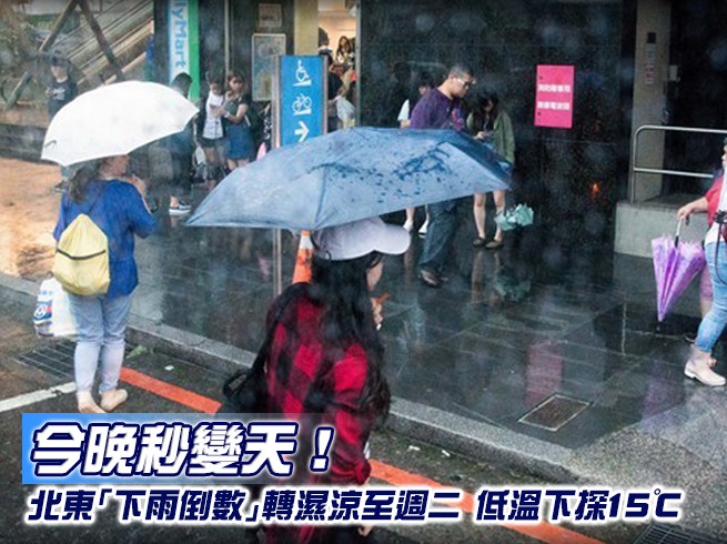 東北季風今(5)早開始通過,而越到晚上,鋒面會逐漸增強,氣象預報員林伯東指出,現在進入下雨倒數的階段,直指雲已經到達頭頂上,隨時都有下雨可能,提醒北部、東半部民眾晚間降雨機率高,會一路濕涼到週二(8),氣溫部分北部則下探15到16度,出門務必攜帶雨具和外套。