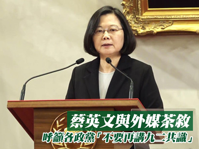 新加坡《聯合早報》報導,總統蔡英文今日與數十家外媒茶敘時指出,北京當局將「九二共識」重新定義為「一個中國、一國兩制」,這個名詞已經不再有模糊空間。她呼籲,全台各政黨「不要再講九二共識」、「不要出賣人民的意志和信任」。此外,蔡英文期盼國際社會為台灣發聲,讓台灣免受威脅。