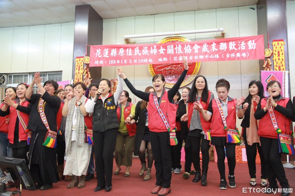 花蓮縣原住民族婦女關懷協會歲末聯歡晚會,現場原住民婦女姊妹以最大熱情迎接縣長徐榛蔚,紛紛高喊「縣長我愛你」,徐榛蔚也展現親和力,與大家載歌載舞,並祝福大家新年快樂,場面相當熱絡。