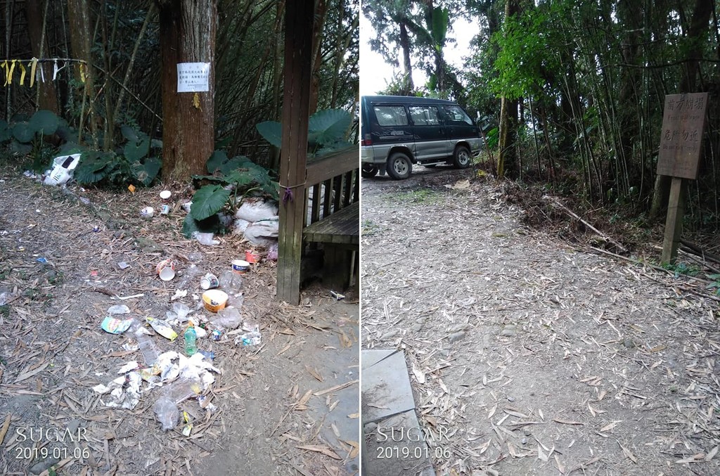 柯姓網友6日在臉書PO出兩張照片指稱,嘉義瑞太古道的觀景台附近到處都是垃圾,只見樹下堆著許多空寶特瓶、泡麵紙碗以及衛生紙屑等,環境確實十分髒亂。村民無奈表示,小村人力有限,加上垃圾車一星期只上山收2到3天,還是希望遊客能配合共同維護,「我們要倒垃圾至少要走到數百公尺外的大回收桶才能丟棄,不像市區家門口就有垃圾車經過。」
