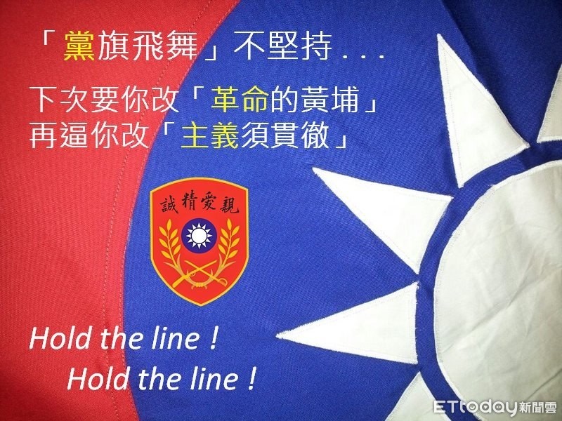 黃介正在臉書解釋,如果「黨旗飛舞」不堅持的話,下次就會要你改「『革命』的黃埔」再逼你改「『主義』須貫徹」。