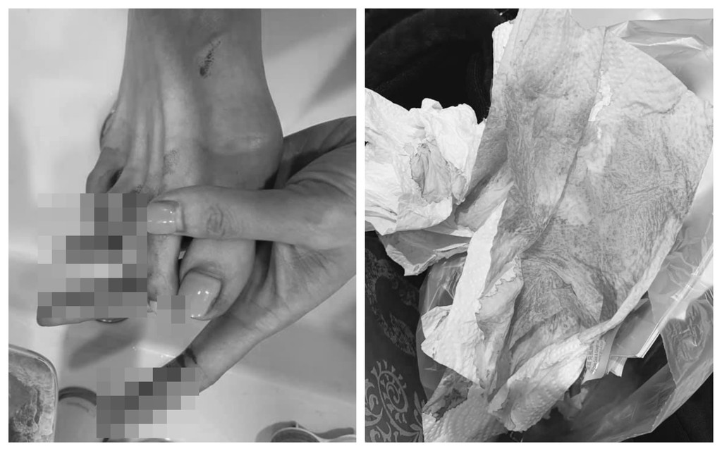 鍾沛君表示,平常在家總是光腳,好幾次踩到水漬險些摔跤,還僥倖地心想「及時穩住」,但這次就沒那麼幸運了,她在前一晚跌倒,這一滑,兩指「開口笑」,現場血跡斑斑,像命案現場,平常自認不太怕痛的她也痛哭了半小時。