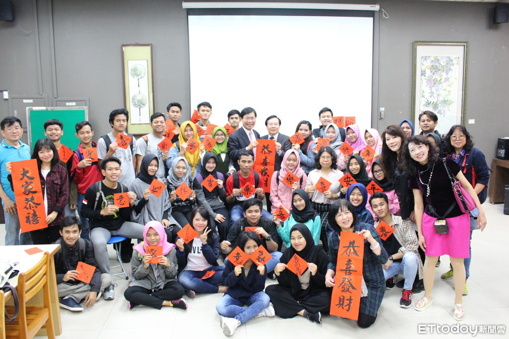 迎接新年到來,中華醫事科技大學1月8日邀請吳英賔等5位書畫名家,到校現場揮毫寫春聯和示範寫意國畫,來自印尼、越南和港澳的外籍學生在書畫家的指導下,拿起毛筆體驗書寫春聯的樂趣。
