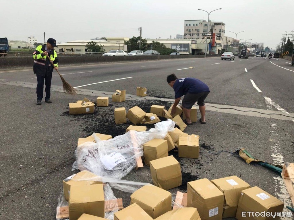 歸仁分局文賢派出所警員謝育朝、陳永倉、黃馨儀及辛佩禪等4員接獲110報案稱於仁德區台86線西往東匝道與台1線口,有貨車因未將貨物固定好導致貨品(內裝長釘子)散落一地,該處屬高雄與台南往來交通主要幹道,員警為恐影響交通安全秩序甚鉅,於所內拿取掃帚及桶子等工具到場協助清理現場。