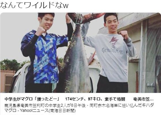 鹿兒島奄美市兩名國中三年級的學生8日下午到海邊玩耍,聽到有小學生大喊「海裡有鯊魚」,於是趕忙衝上前救援,這才發現原來水中的巨物其實是長1.7公尺的金槍魚(通稱鮪魚、吞拿魚),兩人乾脆聯手花了1個小時搏鬥,終於戰勝幾乎和自己身高差不多的大魚。