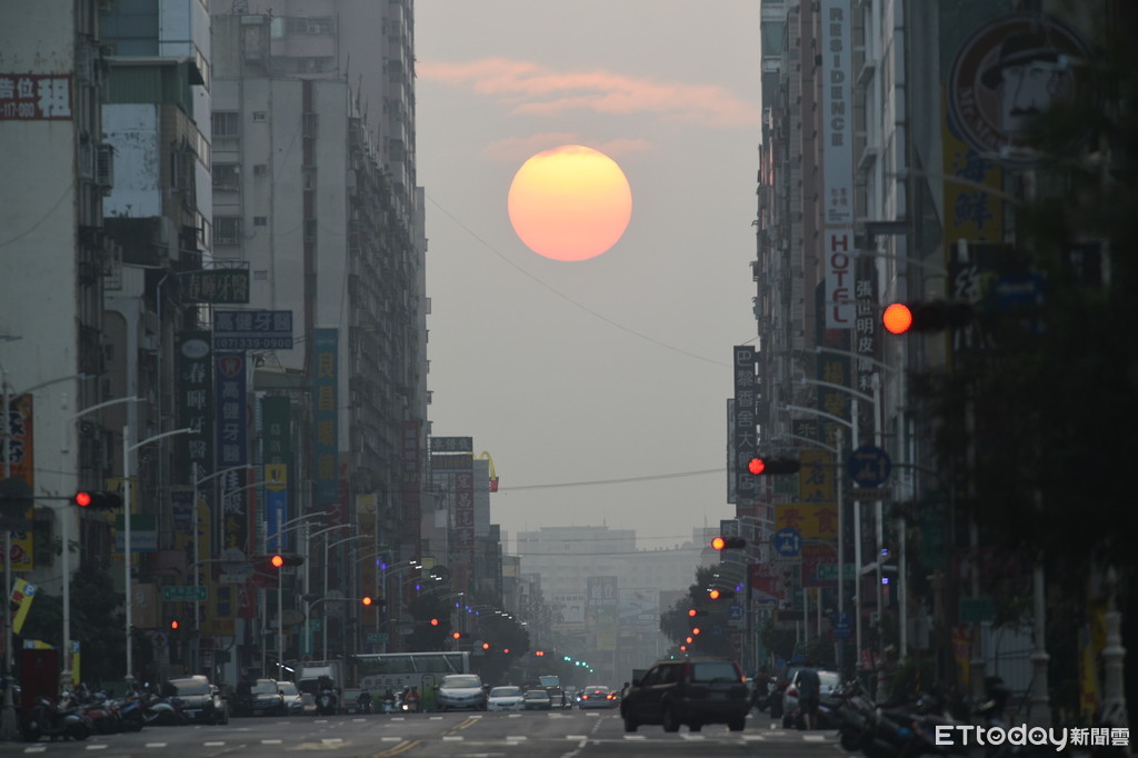 ▲高雄市一心路出現日出懸日,讓旭日光芒無法灑滿街道。(圖/記者宋德威攝)