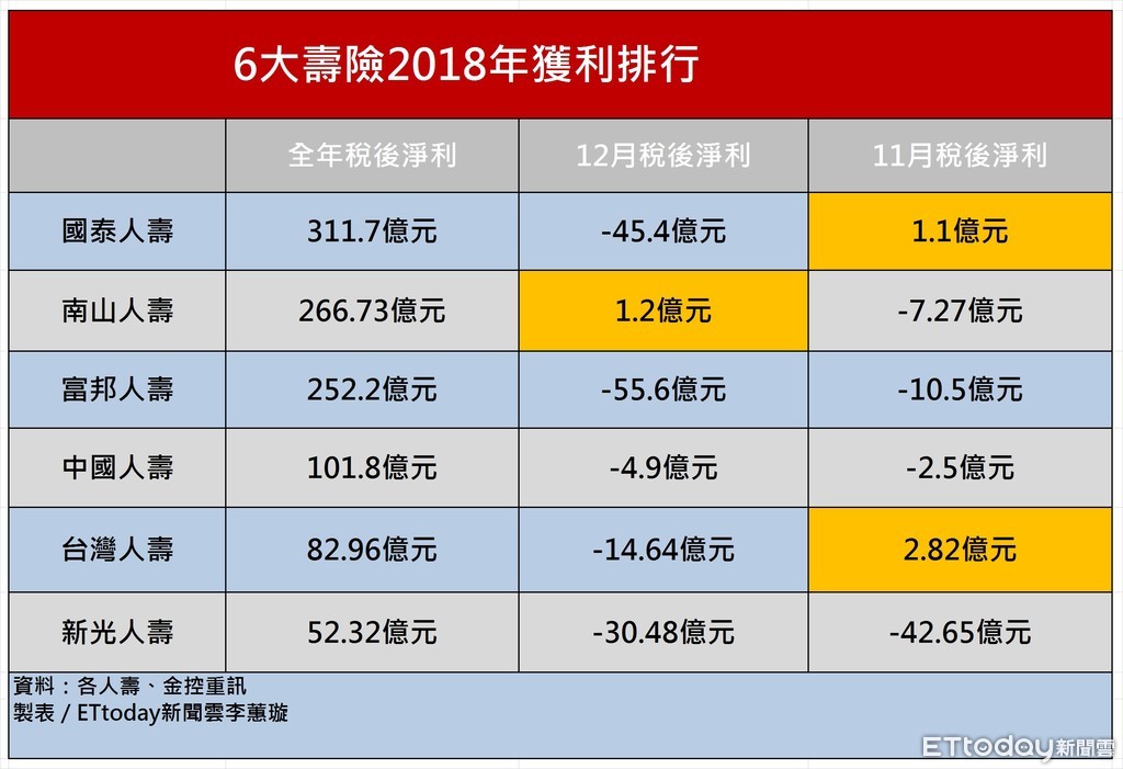 ▲6家壽險業2018獲利排行。(圖/記者李蕙璇攝)