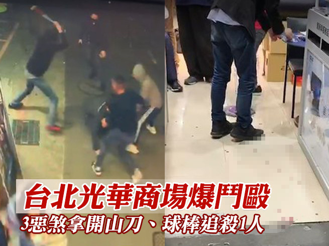 台北市光華商場10日晚間發生一場鬥毆砍人事件,現場有3名惡煞拿球棒、開山刀等武器,自光華商場追著一名受害人不斷砍殺;受害人最後躲進附近巷子一間店家求救,但仍被惡煞追上重擊頭部倒地,店家嚇得立刻打電話報警。警方抵達時,惡煞及受害人均已離開,目前將調閱監視器、釐清事件原因。
