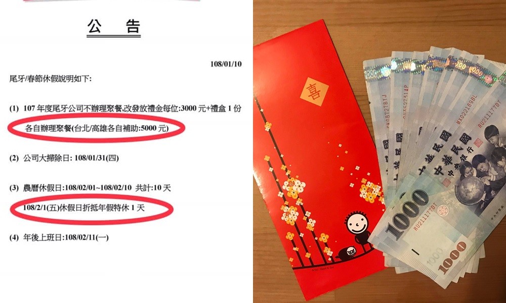 一名女網友在臉書《爆廢公社》表示,因為公司在去年12月底、跨年期間就辦過日本關西員工旅遊了,所以今年就不辦尾牙,「每個人折現3000元外加人蔘雞湯一包,老闆的老公個人再各別贊助台北跟高雄各5000元的聚餐費用。」她說,因為公司過往辦尾牙時沒辦過摸彩,所以折現每人3000元其實真的很划算。