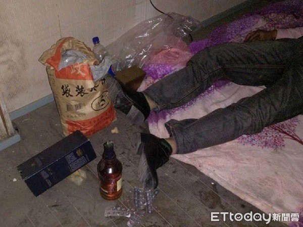 ▲彭男身旁還有正在燃燒的炭盆及多個安眠藥空盒。(圖/大園警分局提供)