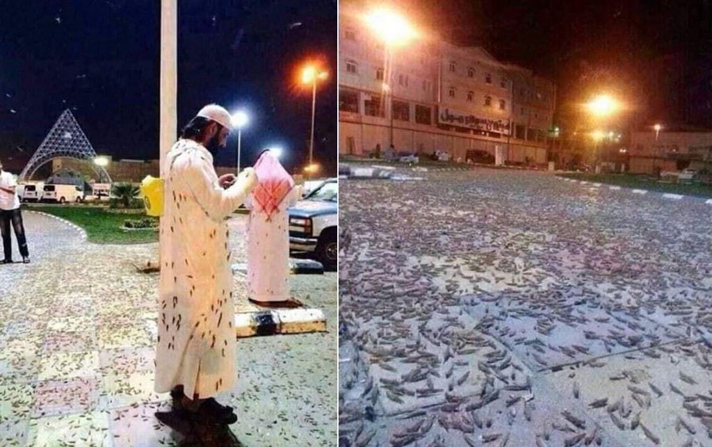 伊斯蘭教聖地麥加近日出現大批蝗蟲襲擊,從社群媒體流傳的畫面可以看到,有成千上萬隻在天空飛舞,猶如「地毯」般躺滿了麥加周圍的地面,甚至有許多朝聖者身上也停滿了蝗蟲。為了民眾的安全,目前政府已派專業團隊進行清掃,並且在清真寺周圍噴灑殺蟲劑。