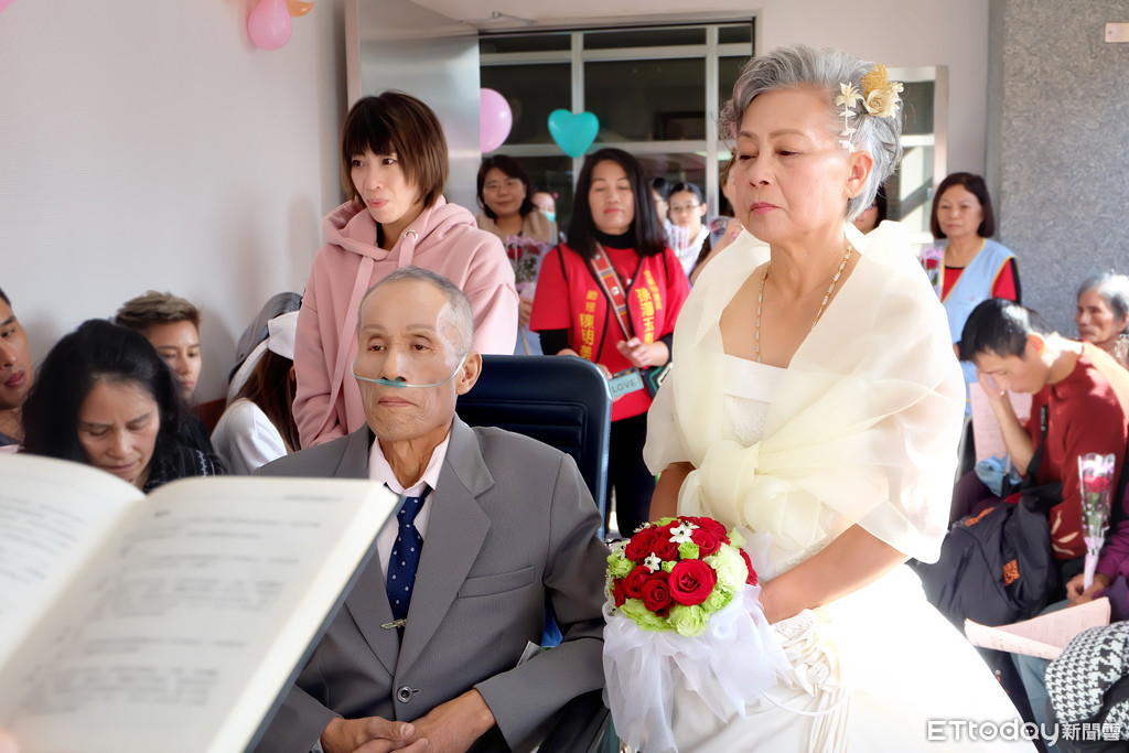 ▲▼癌症末期在羅東博愛醫院緩和醫療中心接受安寧照護的王金泉,10日與他相伴超過20年的黃月花,在親友與醫護團隊的見證下,完成一場隆重又盛大的感人結婚儀式。(圖/記者游芳男翻攝,下同)