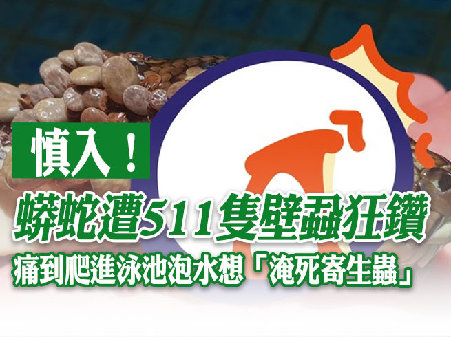 澳洲知名的捕蛇達人哈里森(Tony Harrison)8日獲報前往黃金海岸庫倫伽塔市(Coolangatta)一棟建築物的戶外游泳池抓蛇,抵達現場卻發現,這條地毯蟒身上爬滿密密麻麻的500多隻壁蝨,將牠咬得千瘡百孔。而牠之所以故意爬到泳池裡,就是為了把這些壁蝨溺死。