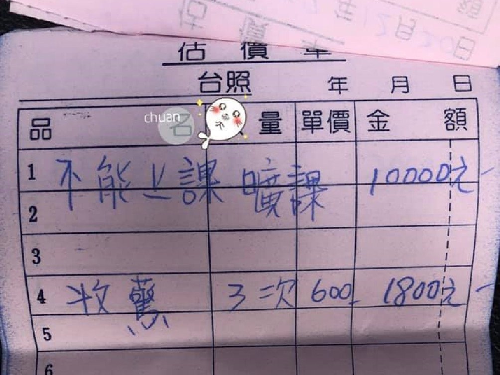 從男網友PO在「爆廢公社」照片可見,4張估價單寫著,「不能上課、曠課10000元」、「收驚600元,3次1800元」、「傷藥粉3罐6000元」、「腳踏車1台3000元」、「貼藥膏數次,2000元」,洋洋灑灑列出一共22800元,每張估價單上都是用手寫的,且單據是為連號。
