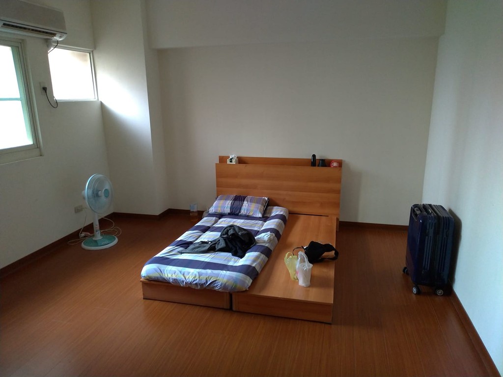 原po秀出自己的房間照片,只見房內擺設超少,除了基本的床板、電扇和冷氣,額外多的東西只有衛生紙和床頭上的3樣小東西,一旁也只看到一只行李箱而不見大衣櫃,連床墊都是單人的,露出半面的木頭床板,相較於一般人的房間,的確相當簡樸。