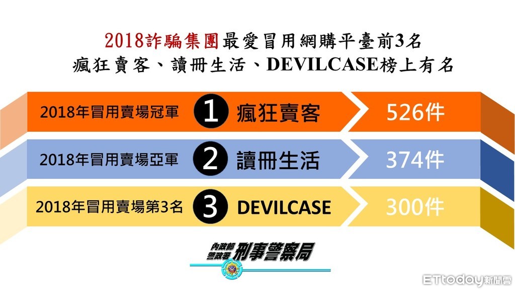 其中,詐騙集團冒用網購平臺榜首「瘋狂賣客」以銷售日用品為主,但消費者購入商品,卻慘成詐騙冤大頭,1年累積526名消費者被騙;「讀冊生活」以販售書籍和二手書為主,去年卻發生374件被騙件數;「DEVILCASE」是販售手機殼,去年也有300件詐騙案件,這3間購物網站均以較低價格吸引消費者,卻因詐騙集團能清楚掌握消費者交易資訊,讓消費者購物花小錢、被詐賠大錢。