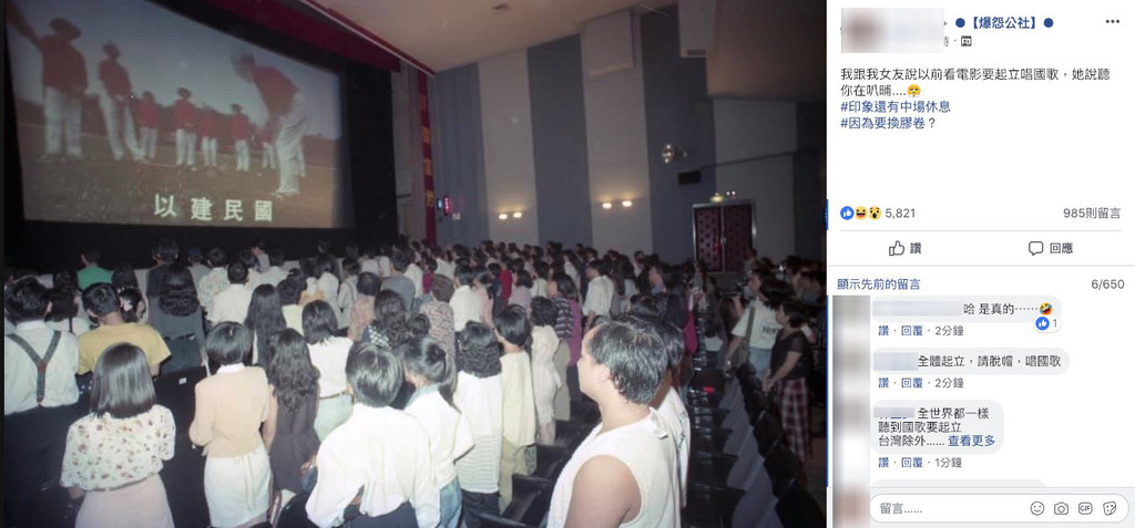 網友發文指出「我跟我女友說以前看電影要起立唱國歌,她說聽你在叭晡....」網友補充說,印象中還有中場休息「因為放映師要換膠卷」。
