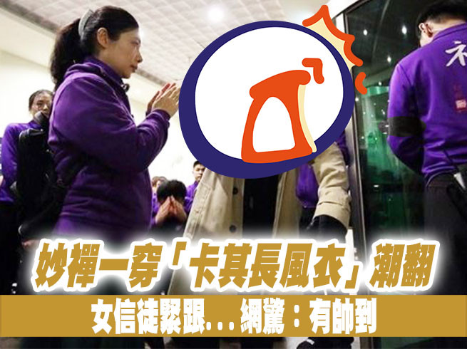 佛教如來宗創辦人妙禪受到廣大信眾追捧,一名網友就分享seafood近況,而他冬季的帥氣造型也隨之曝光。只見散發王者風範的妙禪走在最前端,後面則有女信徒跟隨,幫他拿風衣外套,兩側更有虔誠信徒恭送他離開,讓鄉民不禁笑虧,「天母的最美的風景,莫過於妙禪師父降臨人世間了。」