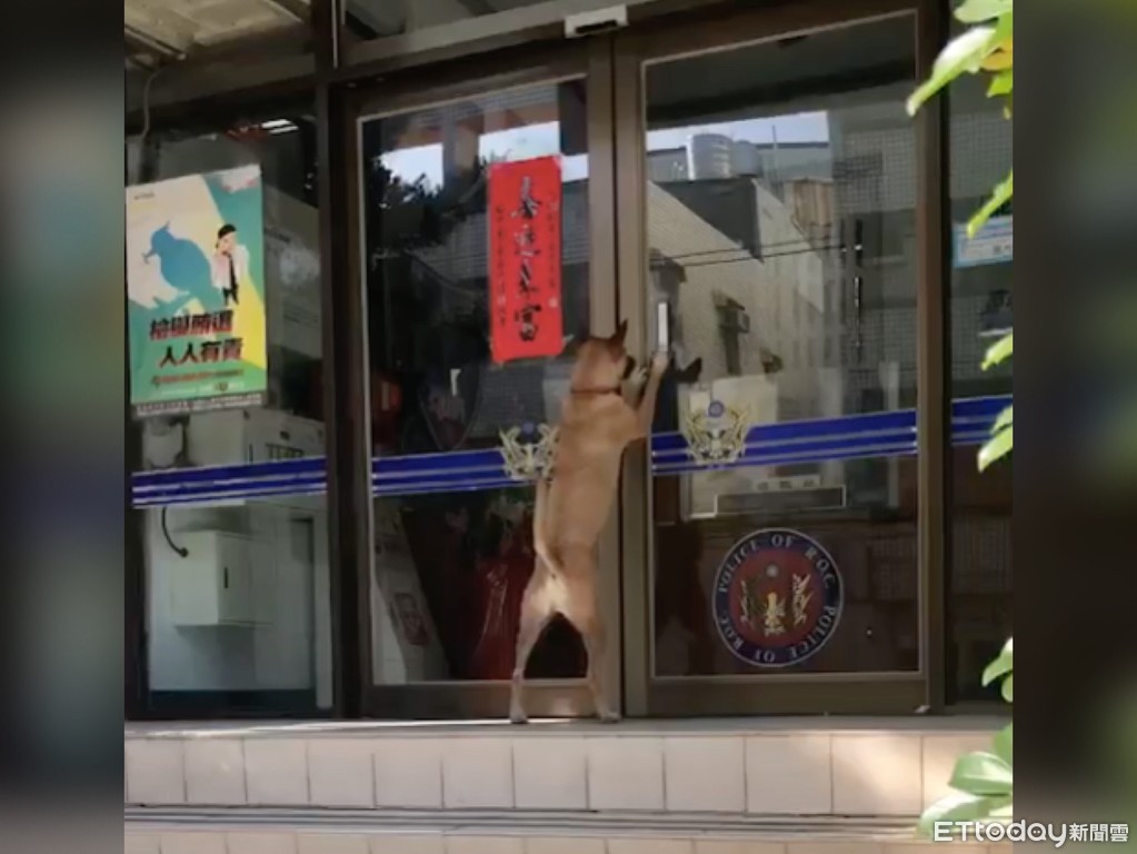 光華所大門為按壓式,且按鈕位置較高,只見「憨吉」先看準按鈕位置,後腿用力站起,前腳肉掌瞄準後用力一按,輕鬆出入進出派出所。
