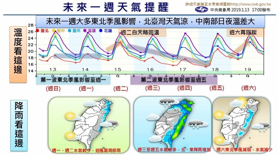 ▲未來一周天氣多為東北季風影響,北部濕涼、中南部日夜溫差大。(圖/中央氣象局)