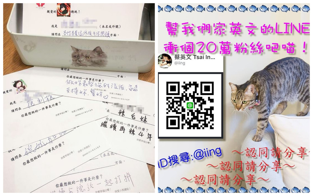 總統蔡英文日前往台南出席活動時,發現很多人沒有她的LINE,回台北後特地在臉書邀請大家加好友。在13日的小英志工團尾牙餐會上,志工團團長代表所有志工,贈送她一個印有蔡英文愛貓「蔡想想」的鐵盒,裡面裝滿每位志工對她的鼓勵或建議,要辣台妹「繼續再辣4年」。
