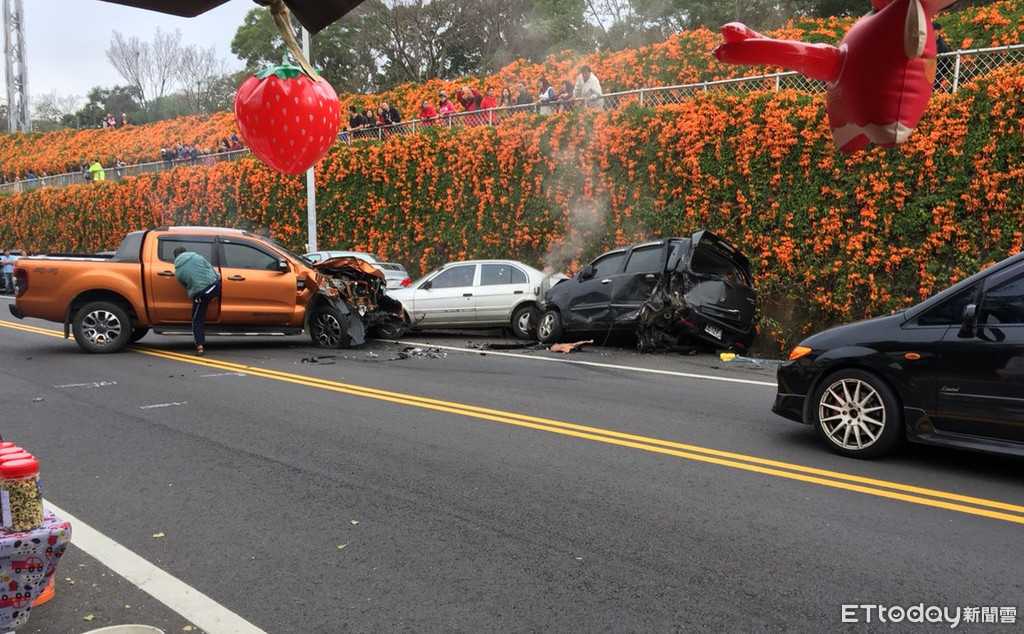 由於當時附近正好很多遊客前往觀賞炮仗花,路邊也很多遊客和攤販,所幸這場車禍沒有波及路邊民眾,但也讓現場賞花遊客飽受驚嚇,至於被撞車子損失還待清查。