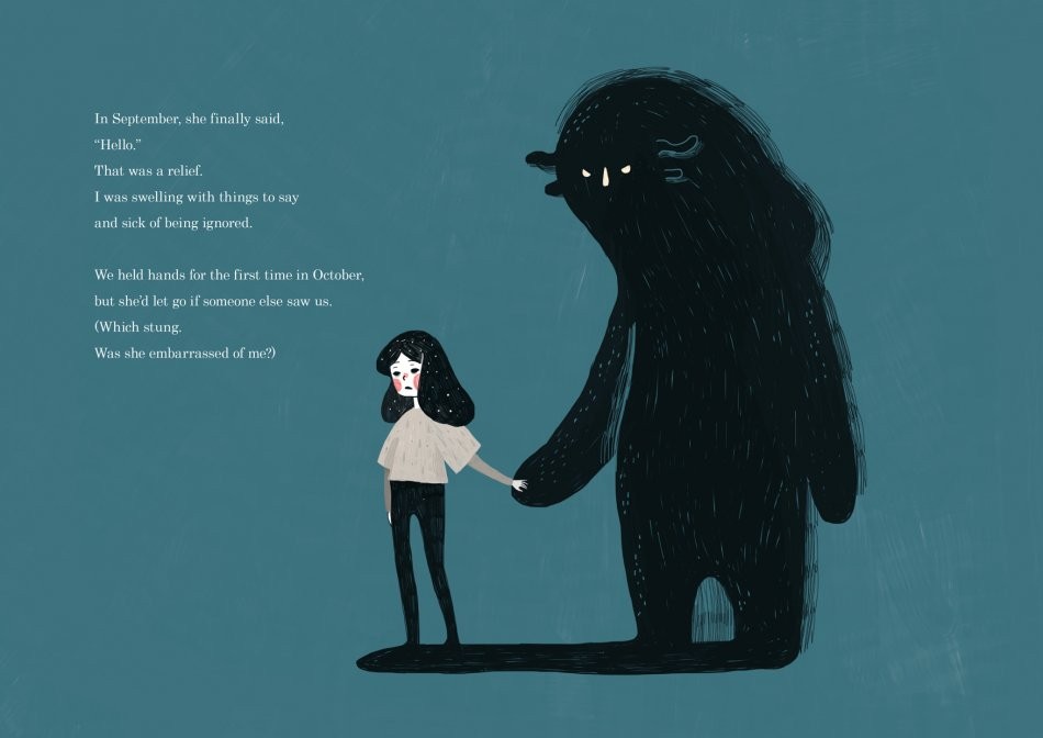 插畫家凱瑟琳・哈內斯塔(Kathrin Honesta)來自印尼,或許是前往異地馬來西亞求學與工作的經歷,她對這種城市寂寞特別敏銳。半自傳式的短篇繪本故事《影子與星星》(The Shadow & The Star)中,延續她童趣、軟調性的人物造型,卻營造出一個生活無望,彷彿隨時都在感冒的病氣女主角,黑洞般的眼神、紅腫的鼻頭,簡直衰到不行。伴隨著女主角的,是一個盤據她心理陰影面積的影子女孩,吞食她生活的寂寞與憂鬱而逐漸發胖,並慢慢變身成為野獸外貌,與她共枕眠,牽手散步,但毛茸茸的手掌卻隱隱刺痛著她。