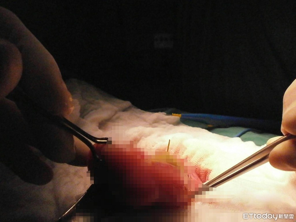 醫師余明昌表示,他研判異物應是魚刺,並且穿過小腸,引起腸液外漏,還已經出現腹膜炎症狀,所以只得緊急手術。打開腹腔,赫然發現小腸竟被一根約4公分的魚刺穿透,出現如避雷針的畫面,該處小腸已化濃,無法局部修補,只好將感染的20公分小腸切除,再進行截斷處重接的吻合手術。小腸全長約400公分,主要是對食物進行消化及吸收,少了20公分影響不大。