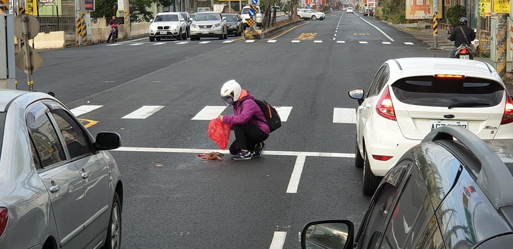 14日上午,車水馬龍的彰化大街上,一名身穿紫色風衣頭戴白色安全帽的機車騎士,就在停等紅綠燈的大馬路上,看到有隻被輾死的小動物慘死在車輪下,於是將機車停在路邊,蹲著手拿紅色塑膠袋將動物屍體抓起帶到一旁,讓網友po上「彰化人大小事」,大讚「彰化最美畫面」。