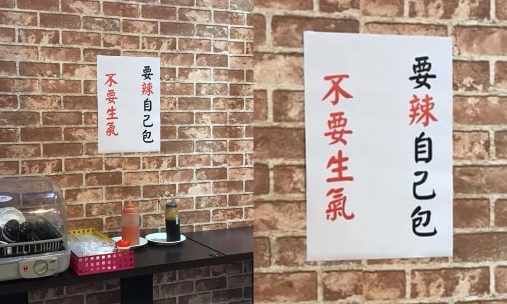 「我朋友說客人一進來就笑,不知道發生什麼事了?」一名網友在臉書《爆廢公社》分享朋友貼文,只見照片中是一間小吃店的餐具區,店家在醬料上方貼出告示「要辣自己包 不要生氣」,短短9個字讓網友忍不住直呼「也不要打人」、「小孩太小看不懂國字怎麼辦?加個注音吧」、「老闆反應很快」、「要辣自己包,不要生氣,更不可以家暴妻小」、「現在賣吃的都有辣椒陰影」。