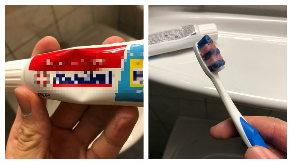這名網友在PTT八卦版(Gossiping)指出,這條牙膏擠出來是粉紅色的,而且把牙刷毛黏緊緊,他的嘴巴也張不太開,為何瑞士的牙膏和台灣的差這麼多?仔細看原PO放出來的「牙膏圖」,瓶身是軟管狀,上面寫著「super haftcreme」,如果用GOOGLE預設的丹麥文翻譯,會得到「超級面霜」的答案。