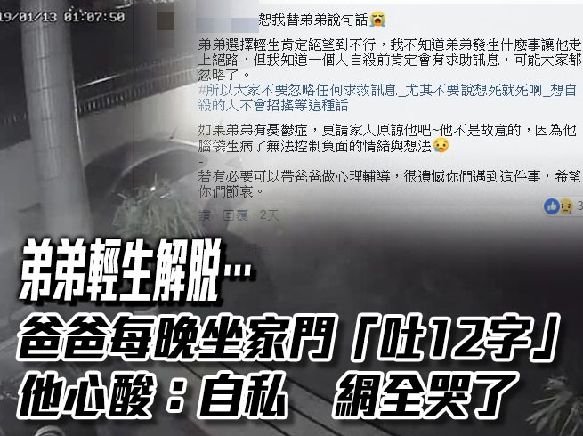 「恕我替弟弟說句話」也有網友說,「弟弟選擇輕生肯定絕望到不行,我不知道弟弟發生什麼事讓他走上絕路,但我知道一個人自殺前肯定會有求助訊息,可能大家都忽略了。如果弟弟有憂鬱症,更請家人原諒他吧~他不是故意的,因為他腦袋生病了無法控制負面的情緒與想法。若有必要可以帶爸爸做心理輔導,很遺憾你們遇到這件事,希望你們節哀。」