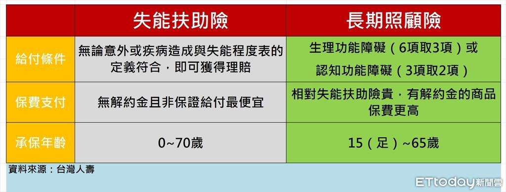民眾可先從「給付條件」、「保費支付」與「承保年齡」三個層面,認識失能扶助險與長期照顧險的保單商品差異性,進而再多了解保障範圍與理賠條件等。