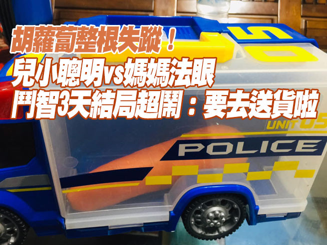 一位媽媽在臉書「爆廢公社」中發文說,「禮拜天找了很久的紅蘿蔔,原來被兒子藏起來了。」只見圖中有輛印有「POLICE」的玩具車,透明的車廂中靜靜躺著一根被綁架多日的胡蘿蔔,原來兇手就是討厭吃蘿蔔的兒子,發揮小聰明直接把來源斬斷,桌上就不會出現相關料理。但是最後兒子還是敵不過媽媽法眼,蘿蔔成功被找回來。