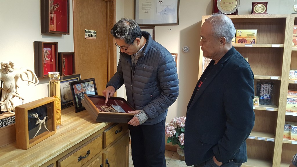 ▲許氏參業集團董事長許忠政先生將自己珍藏的百年參野山參供關瑞之先生欣賞。(圖/許氏參業集團提供)