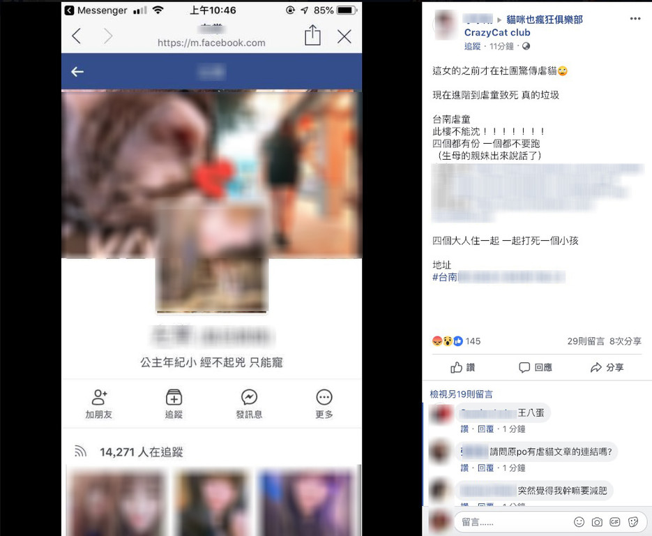 近日虐童事件頻傳,繼新北托嬰中心傳出痛打幼童、蘆洲男因肉圓沒加辣痛打小孩後,今日又傳出台南1歲女童遭生母、同居人、生母堂姊夫妻等4人多次施虐不治。生母堂姊臉書被肉搜後被眼尖網友發現,生母堂姊之前因虐貓被愛貓社團所熱議。