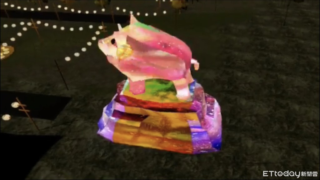 這件名為「2019囍豬屛安VR逛花燈」的作品,是由資訊科學系翁麒耀老師與視覺藝術系朱素貞老師共同指導,3D花燈以豬年節慶民俗以及屏東在地特產做為創意發想的設計靈感,有各種可愛豬豬的形象。